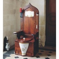 Herbeau Wooden Toilet ThroneSolid Ash with Antique Stain FinishSize: 63-3/4" x 25-1/2" x 29-1/2"The musical chime "Le Bon Roi Dagobert" begins playing as the lid is raisedA tug on the pull chain activates the flush accompanied by the ringing of a bellIncludes full set of accessories including candleholder and ashtray