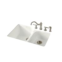Kohler K-5931-4U-0 Executive Chef undercounter kitchen sink with four-hole oversized faucet drilling, WhiteThe Executive Chef kitchen sink offers a large, deep basin on the left with a slightly smaller, moderately deep basin on the right. Space for the faucet and accessories are offset, accenting the gently curved interiors. Made of durable KOHLER; Cast Iron, the Executive Chef provides ample workspace with elegant simplicity.Kohler K-5931-4U-0 Executive Chef undercounter kitchen sink with four-hole oversized faucet drilling Features:; 33" x 22"; Interior dimensions: 12" x 17" (small basin), 16" x 19" (large basin); Overall Dimensions: 33" x 22" x 10-5/8"; Basin depths: L 10", R 8"; Large/medium basins; Undercounter installation; Four-hole oversized faucet drilling; Optional for use with this product: Kohler K-9000 Adjustable P-trap, Kohler K-2989 Countertop cutting board and Kohler K-6636 Countertop cutting board.; KOHLER Cast Iron Lifetime Limited Warranty: Guaranteed not to chip crack or burn*Photo shows Kitchen Sink with sDuostrainer sink strainers and Avatar Kitchen Faucet and soap/lotion dispenser.